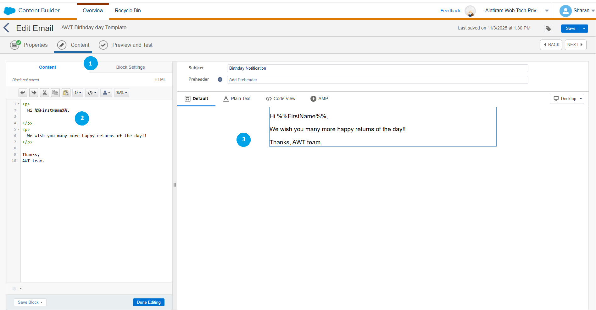After creating a data extension, just prepare email content in the content builder (1) that will be used for A/B Testing. The message that I have used here is a simple birthday greeting message (2). I have included the first name (3) of the prospect from the data extension using a simple AMPScript tag.