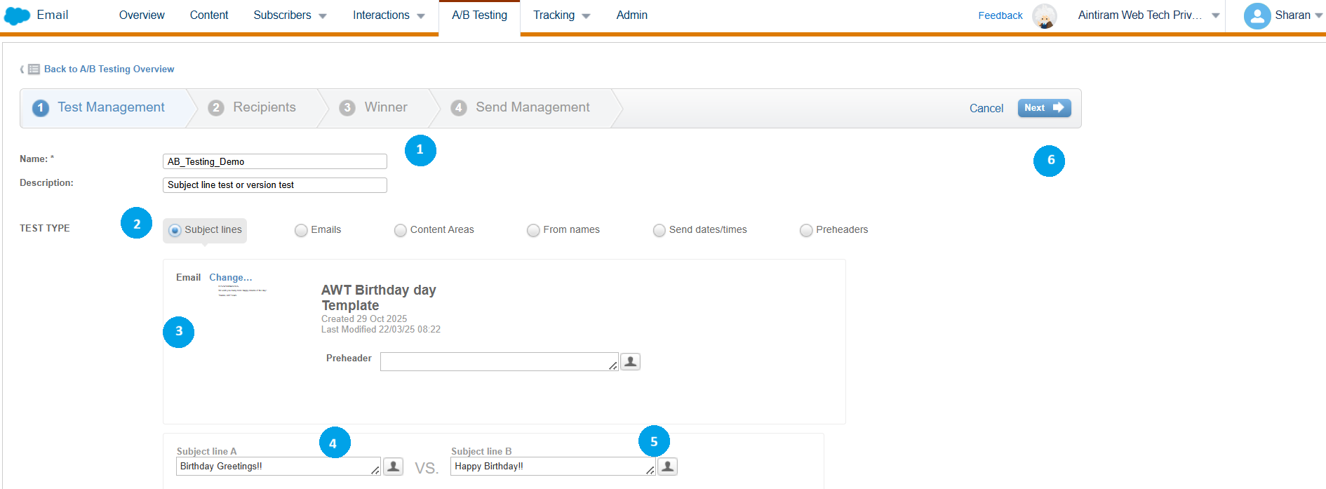 Name the A/B Testing (1). Here, I have named it "AB_Testing_demo". It will help to identify the scene which we are testing. Select type of the A/B Test (2). Whether you are testing subject lines, email copy, sender names, delivery timing, or preheaders. After that, please select the email content that needs to be used for A/B Testing (3). You could replace the subject line (4) or you can leave as such. Choose another subject line (5) that you have in the A/B Test. Select next (6).