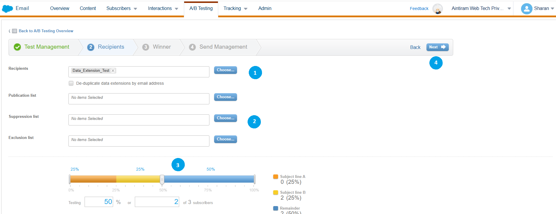 Select the data extension that content prospect details to send (1). If you need any list in the suppression list section or exclusion list section, include it (2). Here for this demonstration I haven't used any suppression or exclusion list. Select the percentage of the audience that needs to be tested before, and winner version sent (3). Then select next (4).
