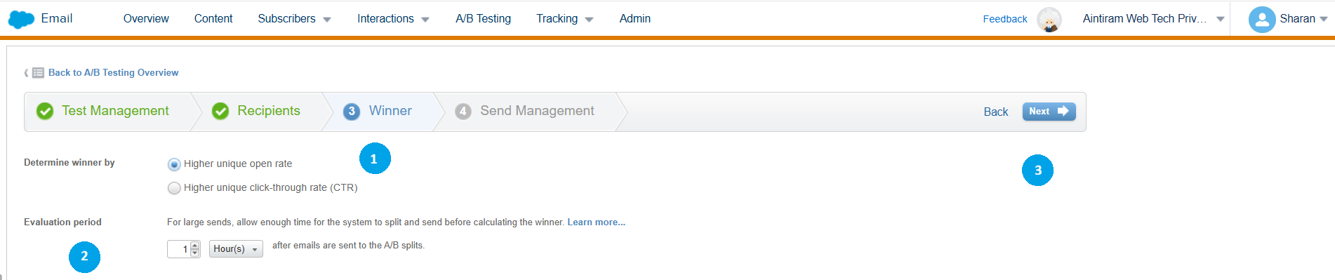 Determine the winner by a higher unique open rate or by higher click-through rate (1). Then, select the time period. A minimum of 1 to 4 hours should be determined (2). We can also set the day. Then, click on next (3).