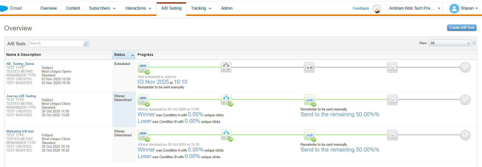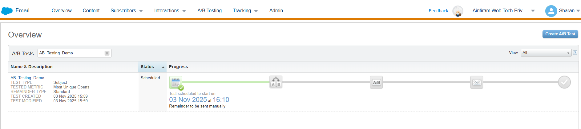 In the A/B Test tab, you can see your scheduled A/B Test.