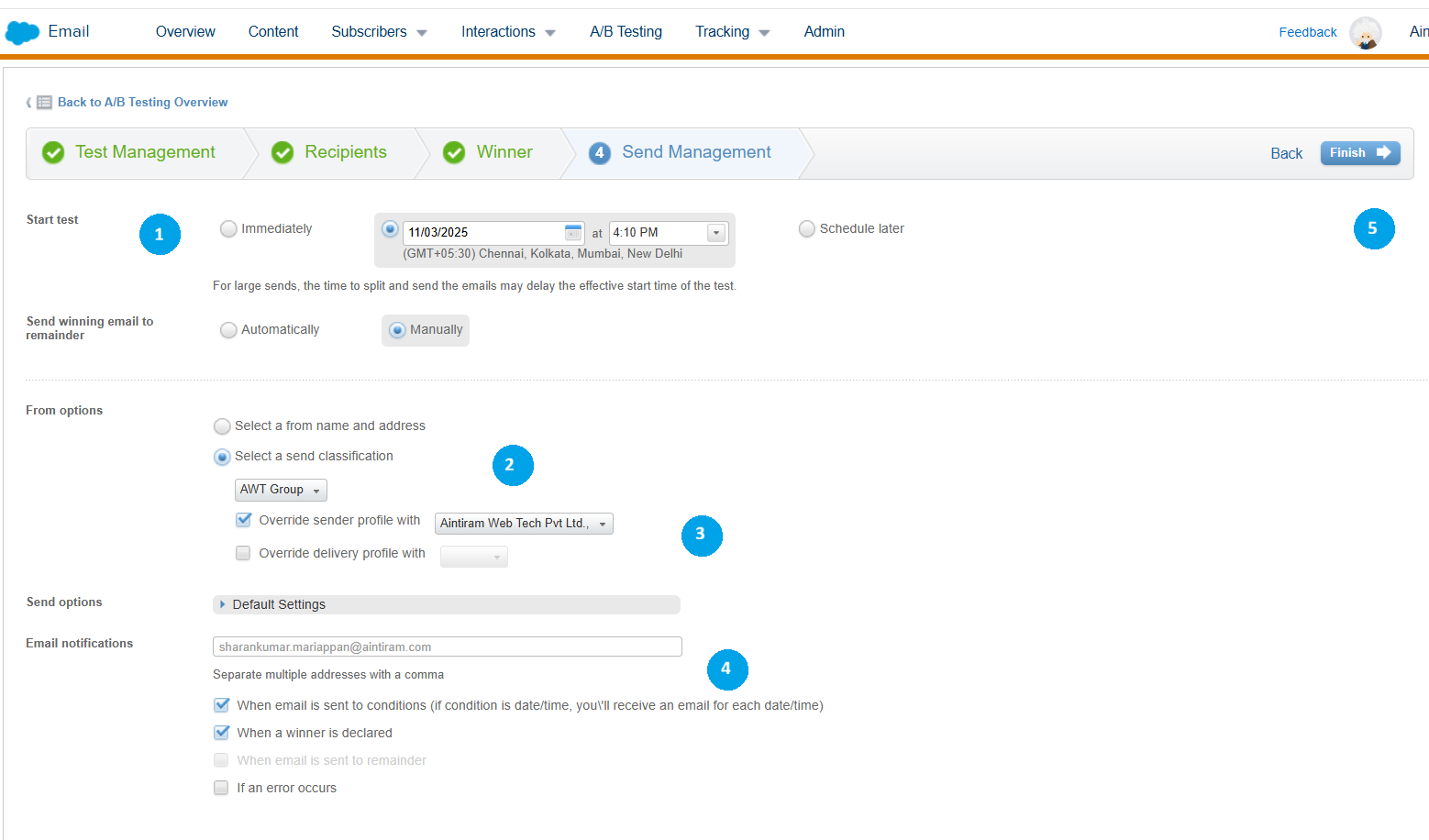 We set the send time to be immediately (1), or it could be scheduled for later. We can set the send winning email to remain either manually or automatically. I have set it here manually. You can select the form name and address (2) or can choose the send classifications (3). Include the email address in the email notification (4) section to receive information on the winner (specify the condition). Then, click on finish (5).
