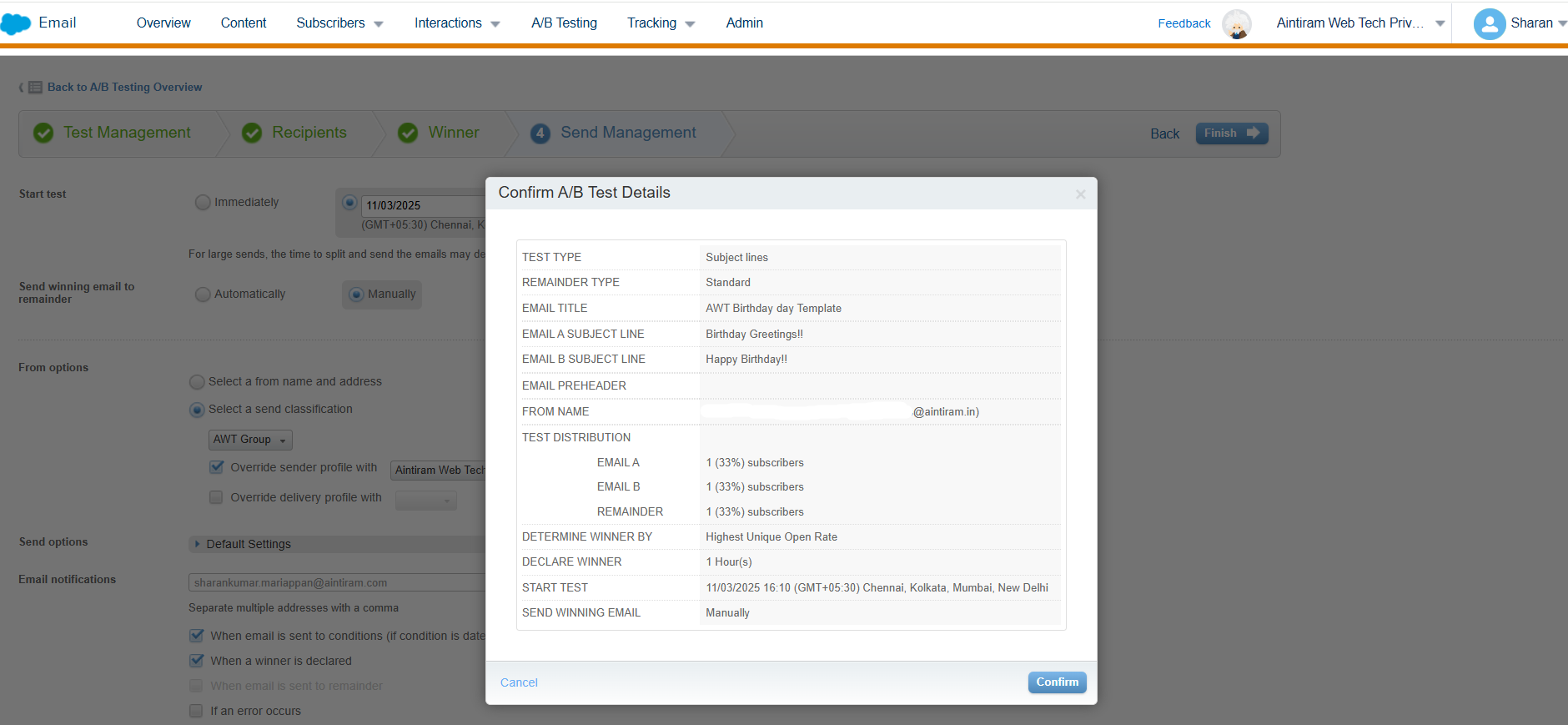 Review the A/B Test details and click on confirm.