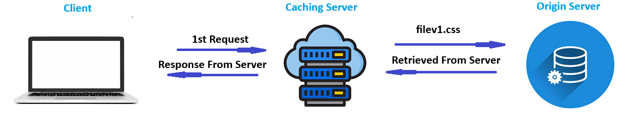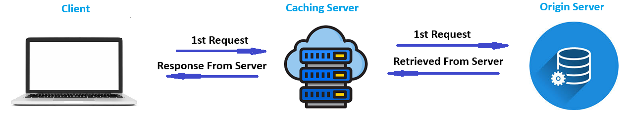 At first request, it checks the Cache server and there is no data. Then it requests from the actual server and the data is retrieved from actual server, it stores in the Cache server.