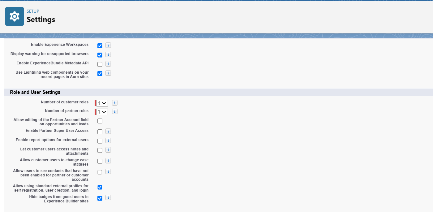 Under the Digital Experiences, access the Role and User Settings section > Check the option of Allow using standard external profiles for self-registration and user creation in the digital experience.