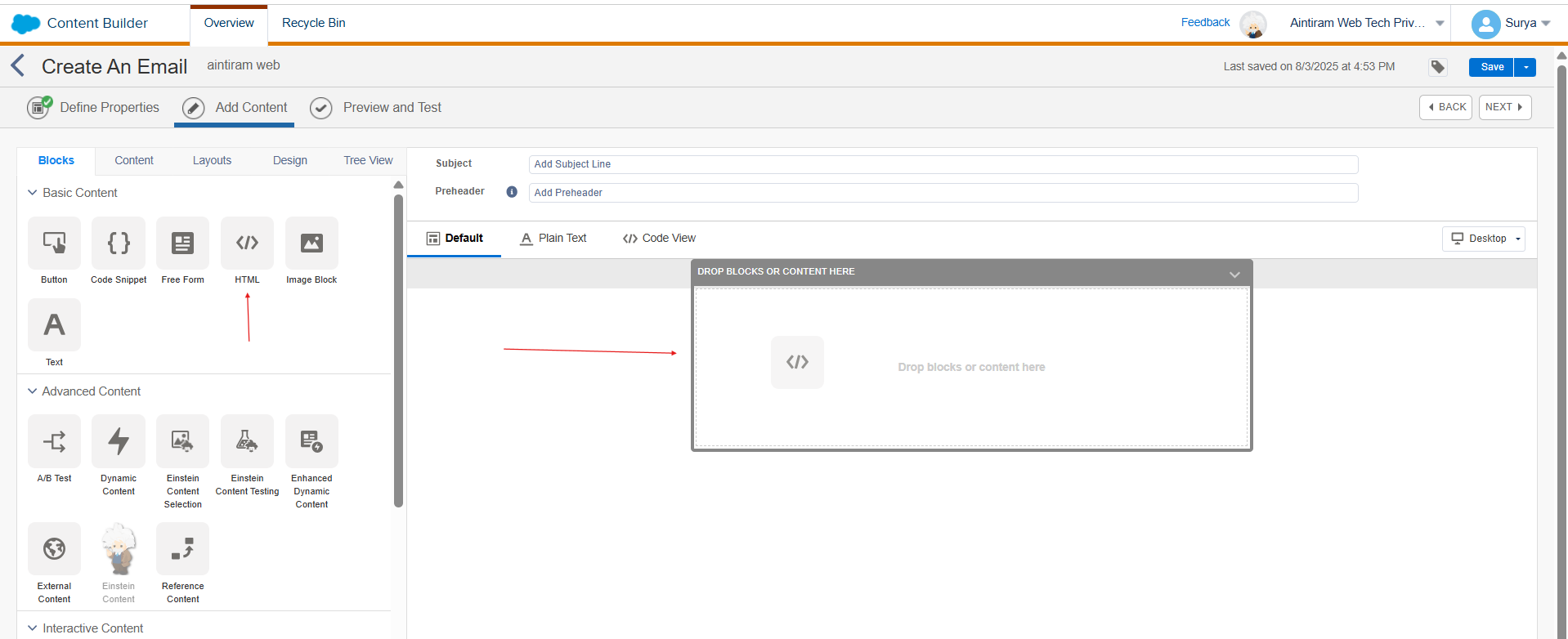 Blocks: These are the building elements of your email, like text, images, buttons, or dynamic content. You can drag and drop these blocks into your email to design.