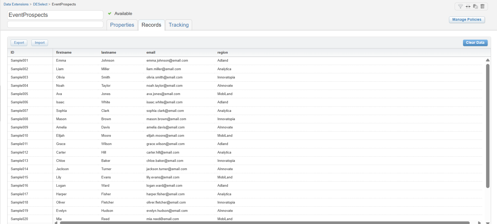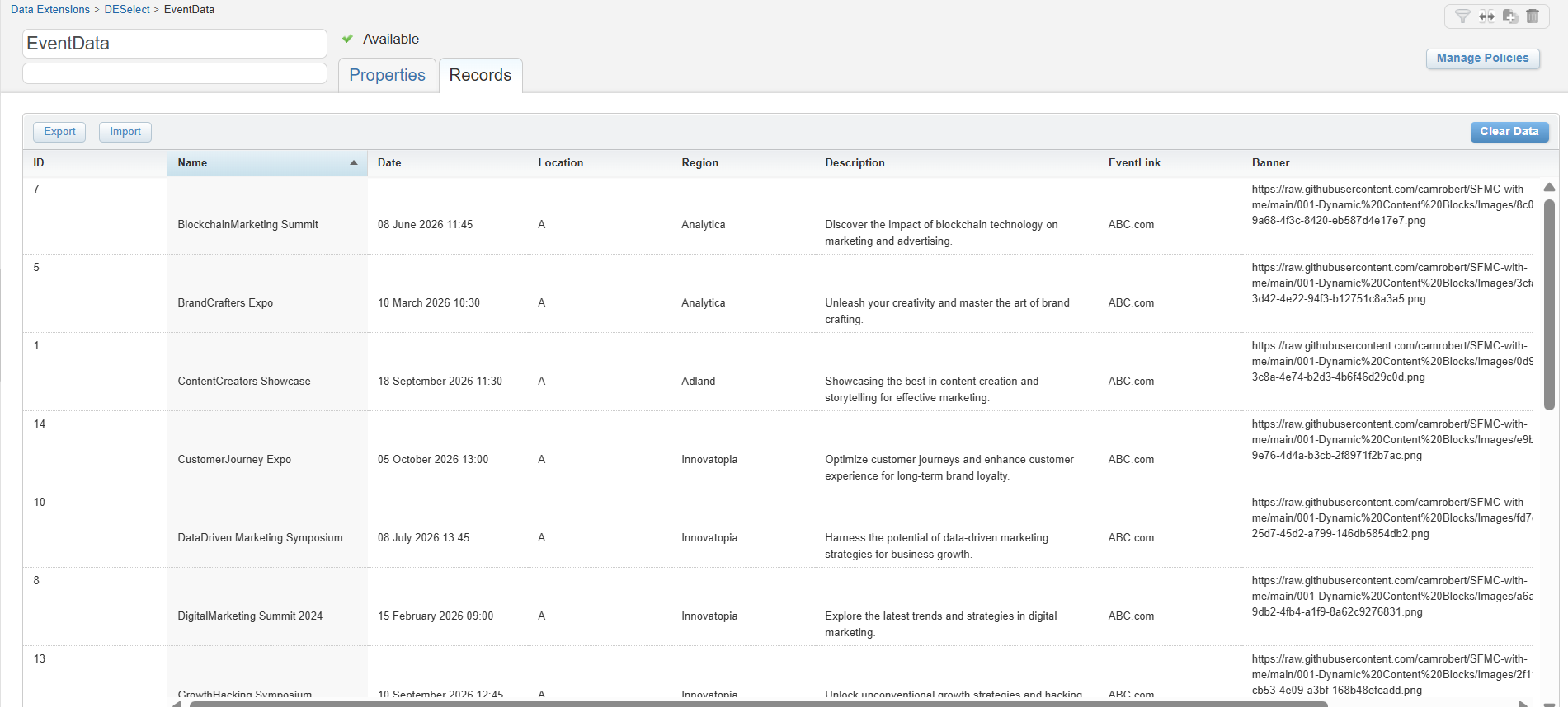 Note: For you to practice, we suggest you use this sample data or else you can create your own sample data based on the screenshoot of attached data extension screenshot. You can download the data from gitHub, link mentioned below: https://github.com/camrobert/SFMC-with-me/tree/main/001-Dynamic%20Content%20Blocks.