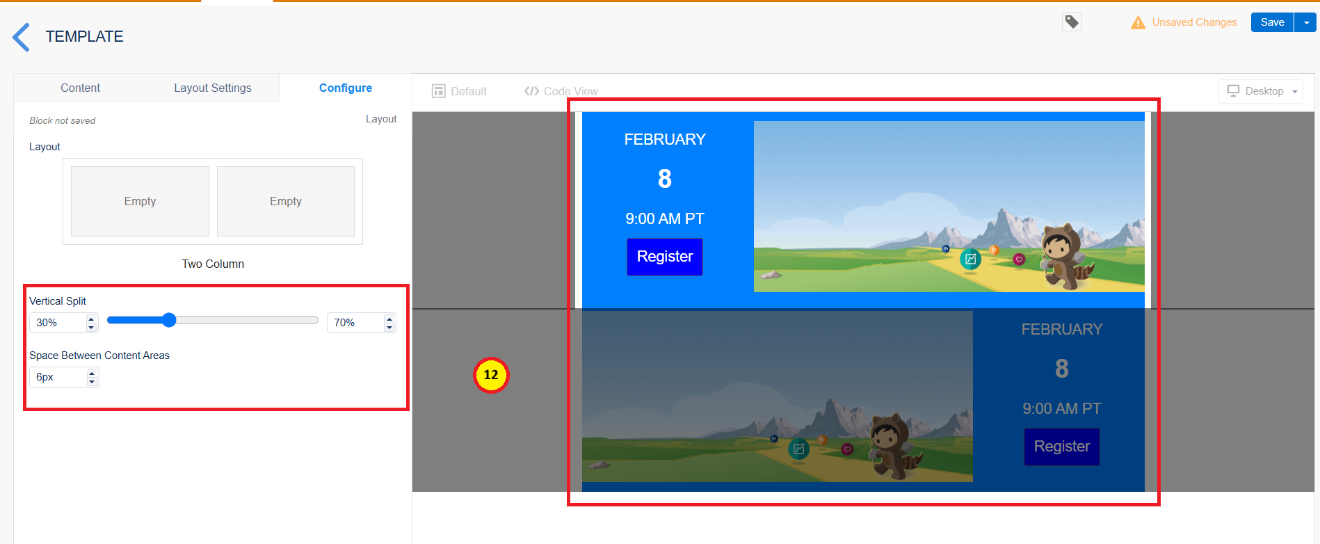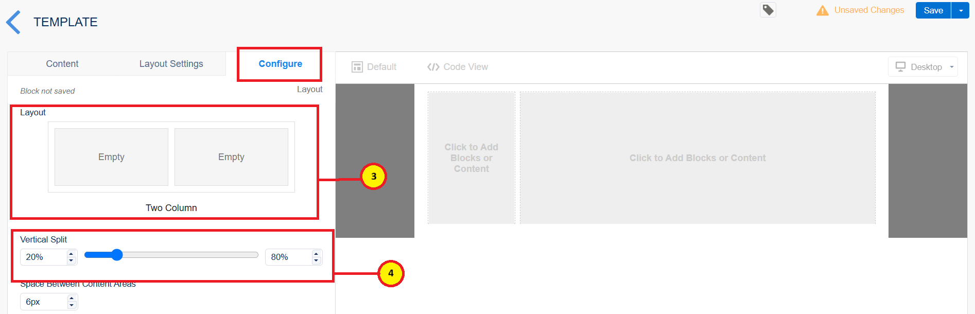Next, navigate to layouts in the template. Select the two-column template as shown below (3). Configure the vertical split for both the columns as 30% and 70% respectively (4).