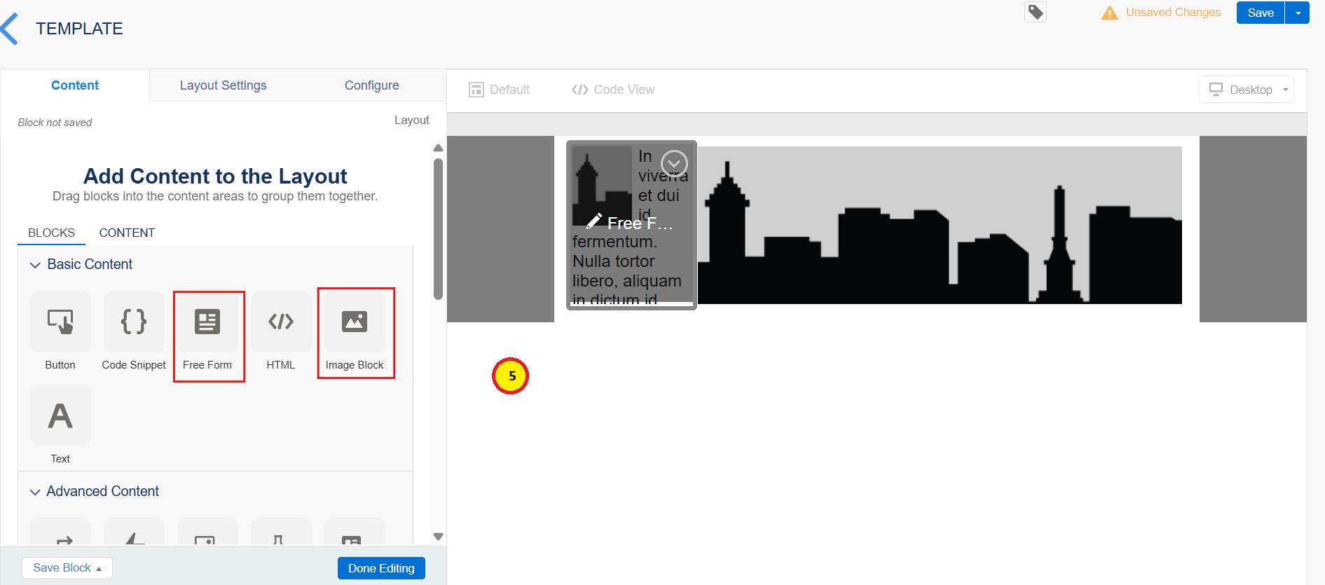 Just drag and drop image block and the free form. In the content sections, just drag and drop Free Form and Image Block to the two columns as shown below (5).