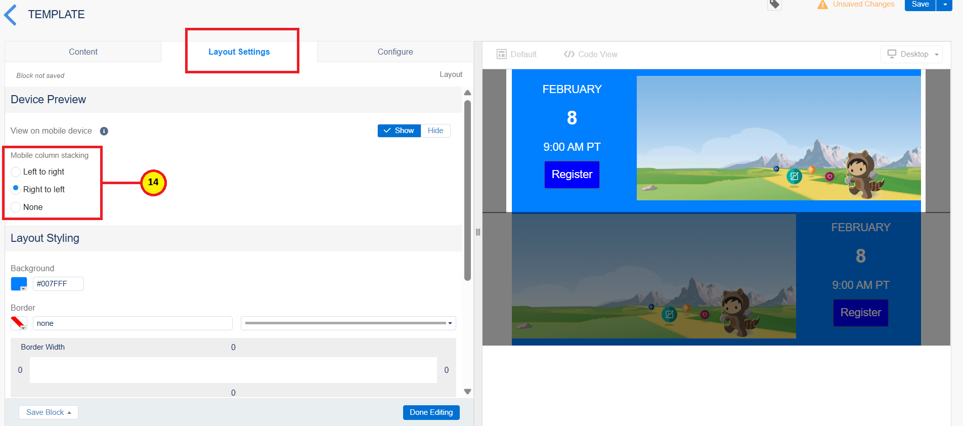 Since we are building a responsive design, create the duplicate for the one we have created to check the responsive alignments (11). Just drag and rearrange the images as shown below. For the image to be appear more appealing. Change the column’s vertical split to 30% and 70% for the first image and 70% and 30% for the second one (12). While we are minimizing the screen to mobile view, we could see the image first, then the date and time details (13). For that, I have configured the layout to appear from right to left for the first one (14).