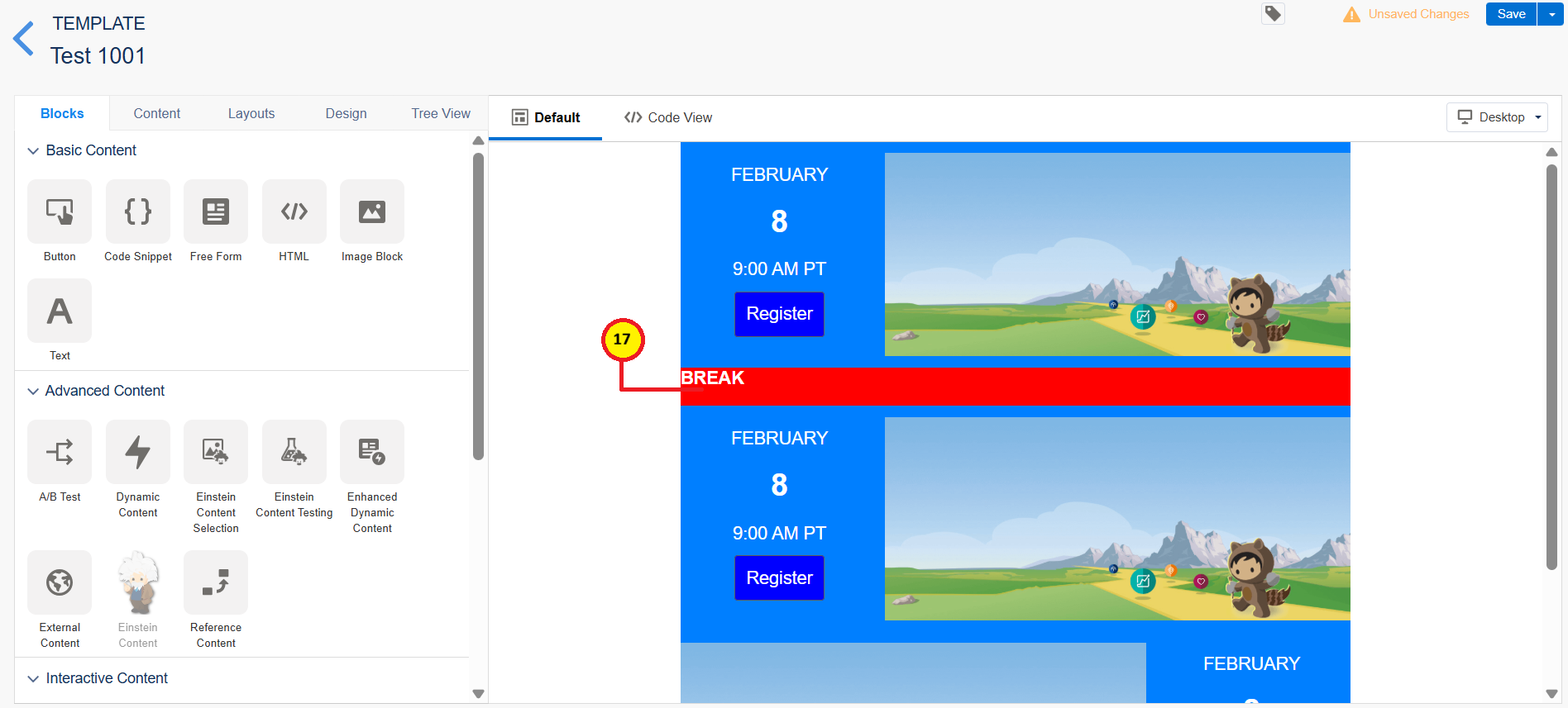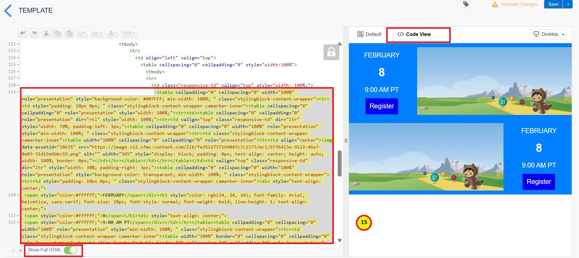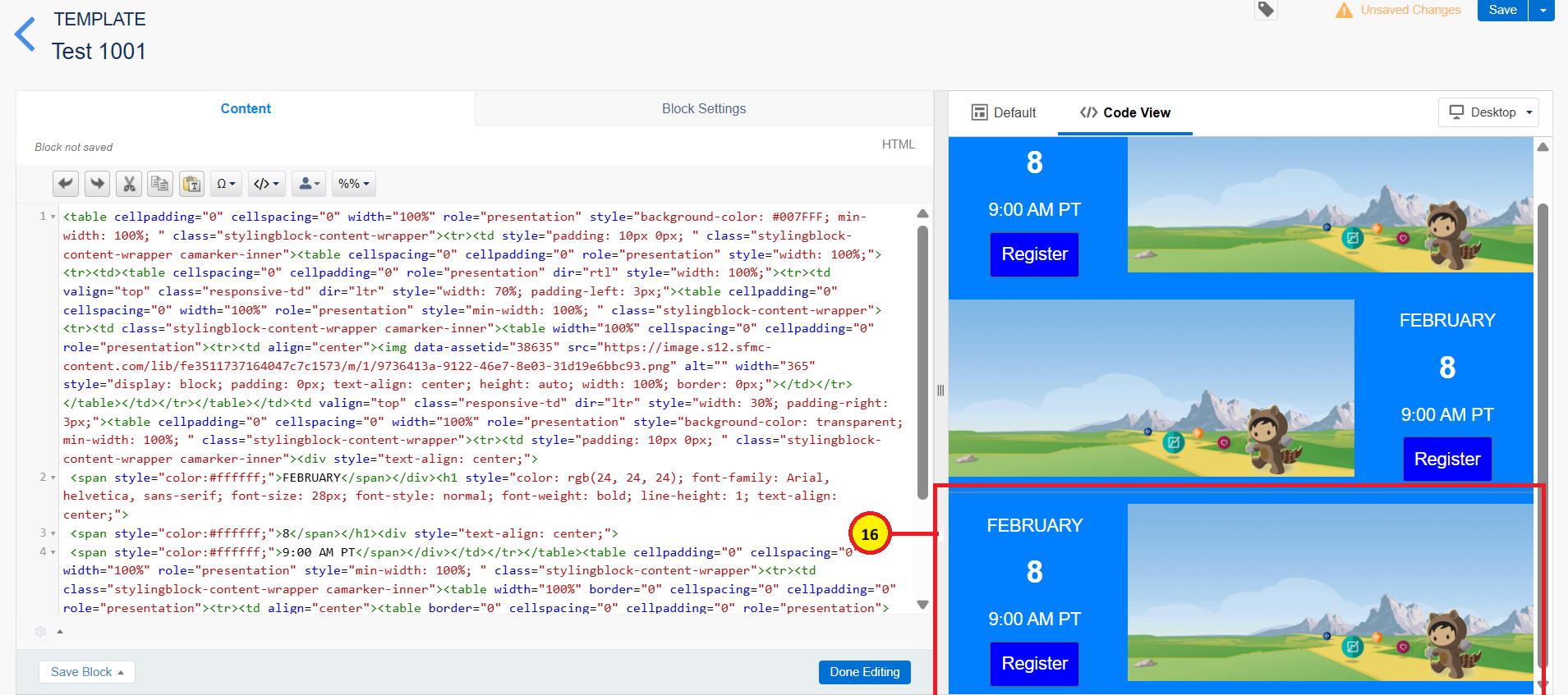 Just copy the code for the second one, from the code View. The yellow highlighted one is the code for the block created by dragging and dropping (15). Now, add the HTML block inside the template and paste the copied code. By copying the code you will get a same design as shown in image below (16).