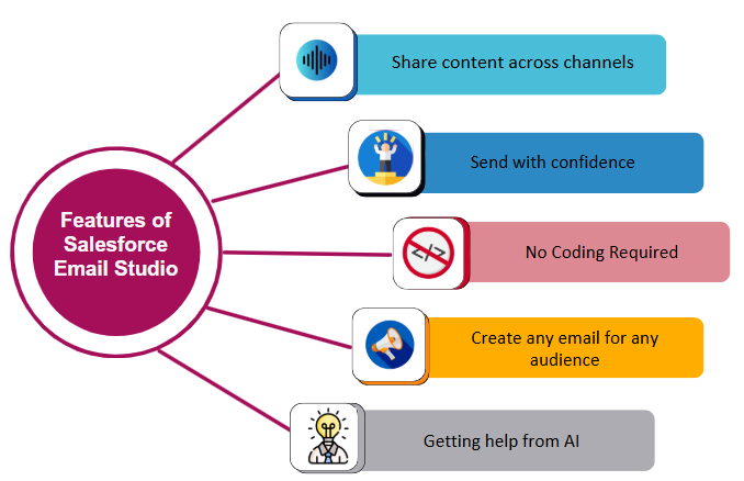 Without needing any code, you can easily create and send personalized marketing email campaigns to the customers by using one of the most powerful email marketing tools in Salesforce, which is called Email Studio. With Email Studio, you can design and build your content with less effort by using the content builder with various options for customization, which is available in the Salesforce Marketing Cloud itself.