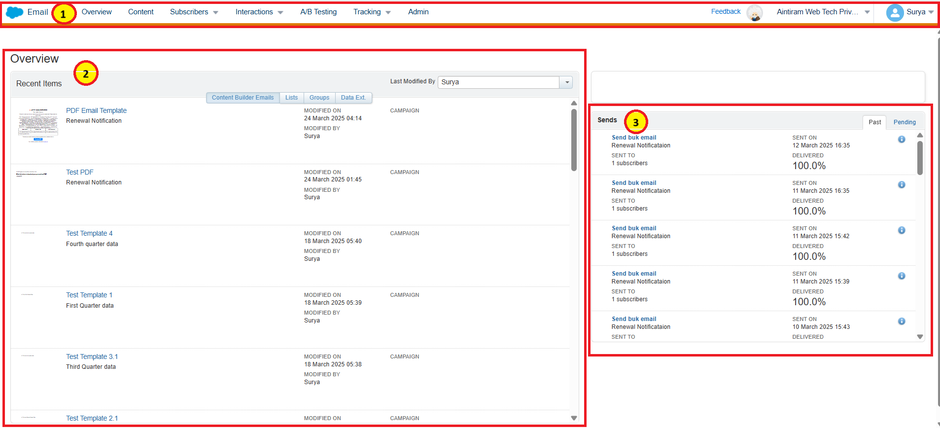 Overview - The Overview component displays all recent items. It includes content builder emails, templates, and data extensions.