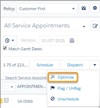 In the dispatcher console, we can see the action button named Optimization. By clicking this, we can filter out the appointments that need to be optimized and proceed with optimization.