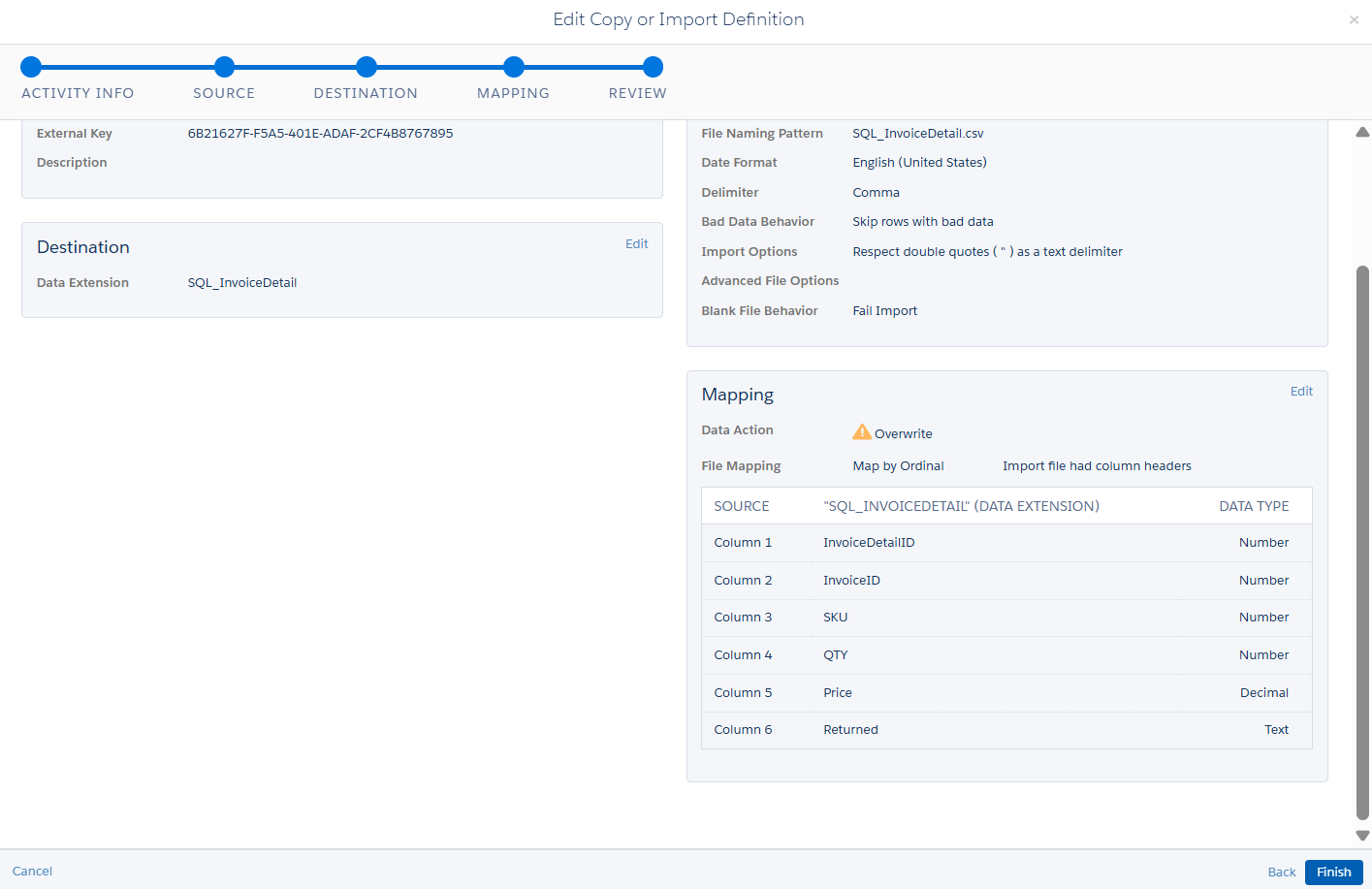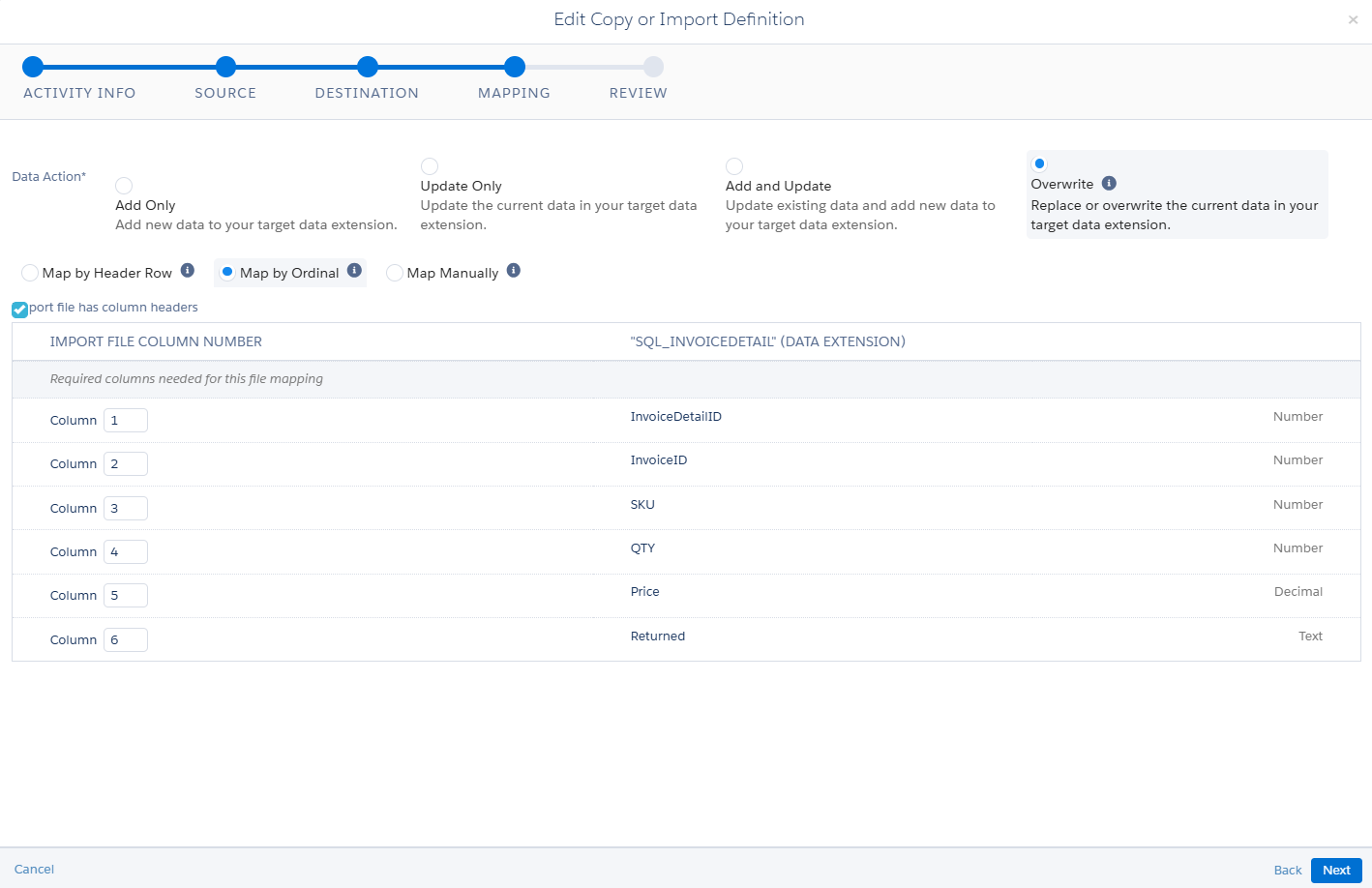 Then, it comes mapping section. I have just selected the overwrite and map by the ordinal. Based on your requirement, you just select the appropriate mapping fields.