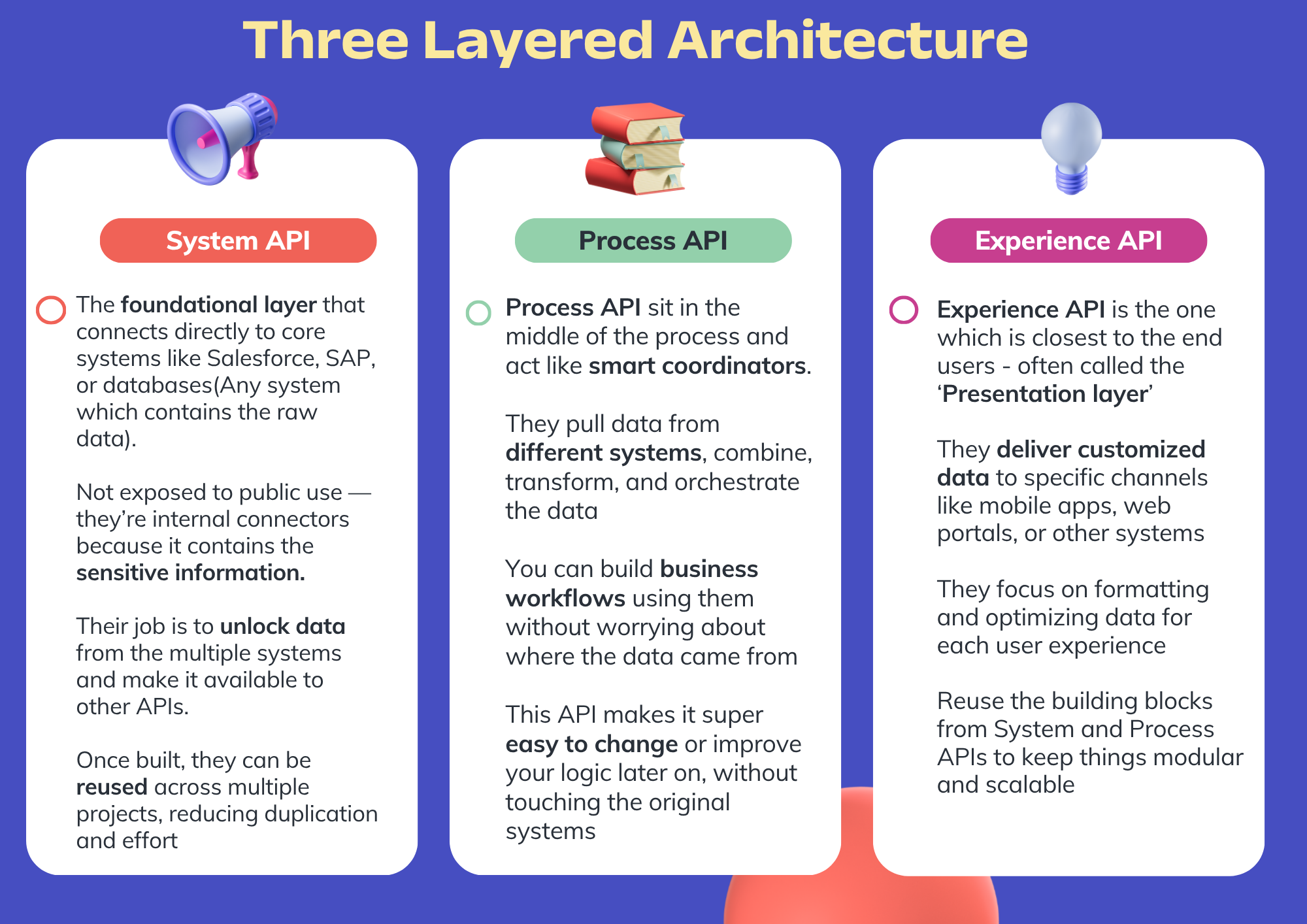 This gap in previous integration approaches gave rise to API-led connectivity—a structured approach discovered by MuleSoft that organizes all the APIs into three distinct layers: System APIs unlock data from core systems, Process APIs orchestrate and transform that data, while Experience APIs deliver data in a channel-specific way. Unlike the old days of ESBs or scattered APIs, this layered model encourages reusability, speed, agility, and governance, and allows organizations to build application networks where APIs act as reusable building blocks.