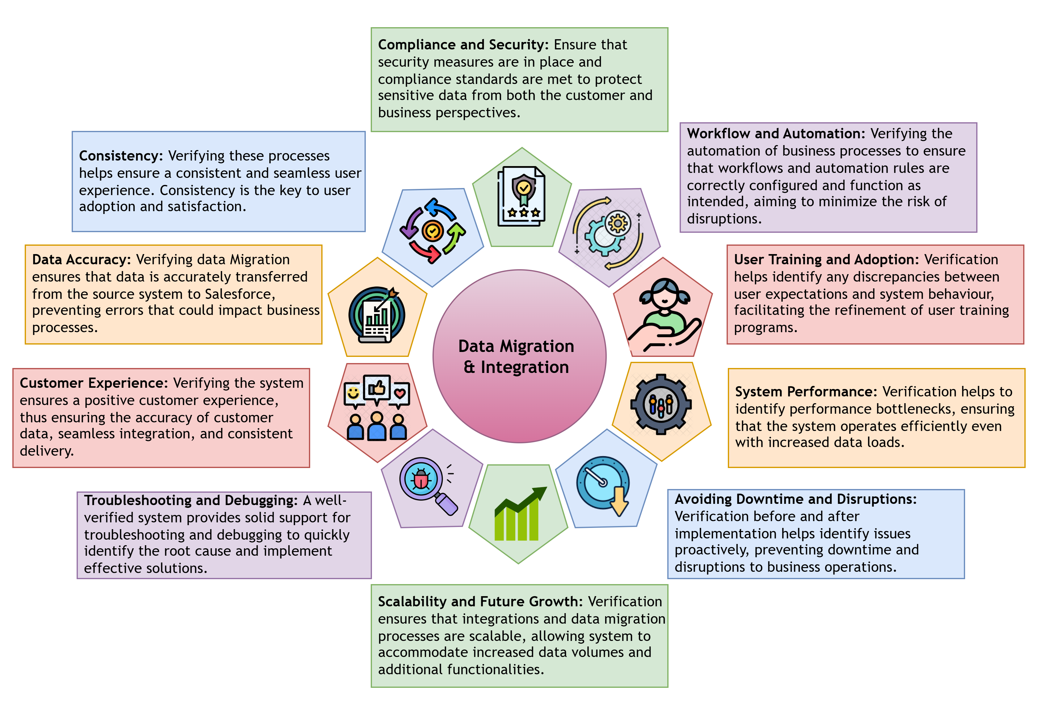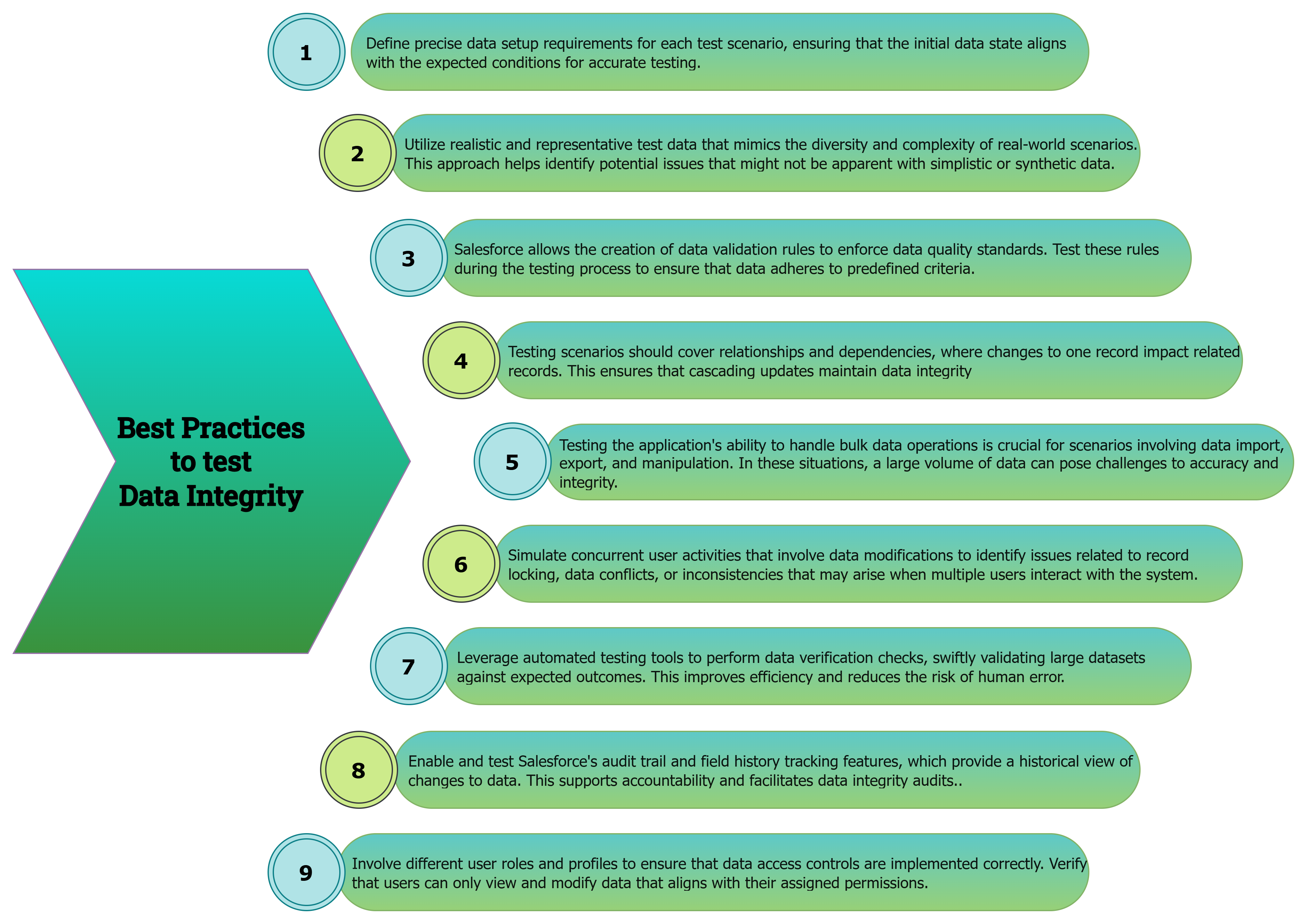 Here are key considerations and best practices to ensure data accuracy and integrity in Salesforce testing: