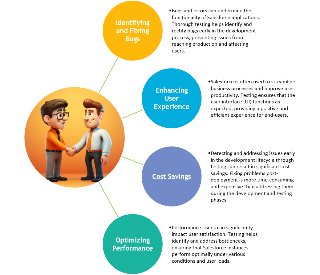 Salesforce is an end-to-end qualified CRM, which doesn’t require additional Testing. But the Customizations and Configurations supplemented to the CRM are built from ground zero, hence the testing of these supplements are mandated. Testing validates these customizations, ensuring they align with business requirements and do not introduce unintended consequences.