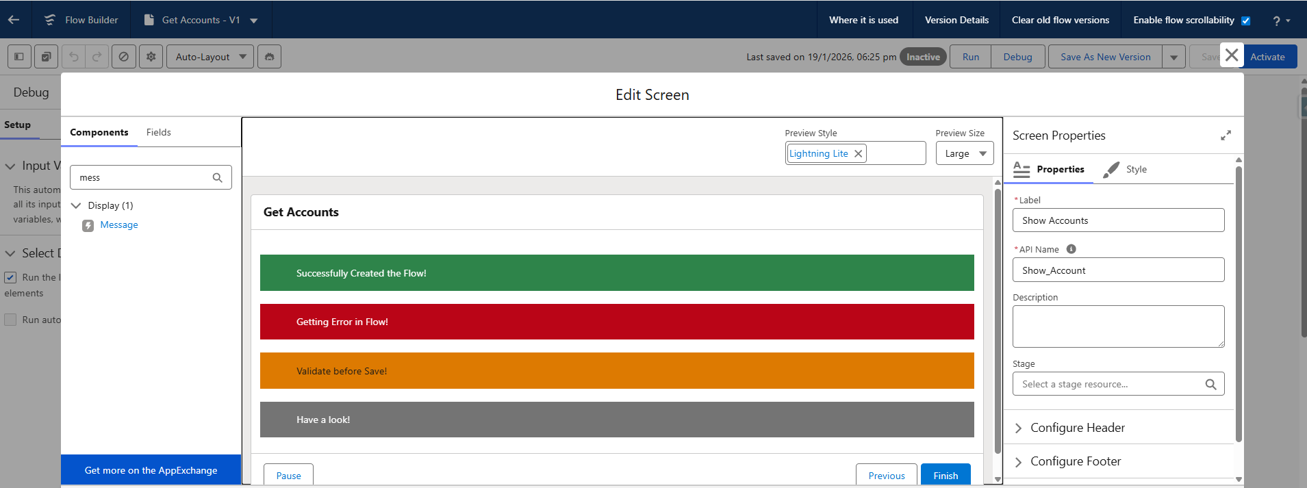This is one of the most awaited features for me and I was expecting toast-style messages, but it shows messages as banners inside the flow screen and that’s actually great. You can display success, info, warning, or error messages right where users need them. It works similar to Lightning Messages in LWC, but now you don’t need extra components or custom code. These message banners make flows more interactive and improve the overall UI experience.