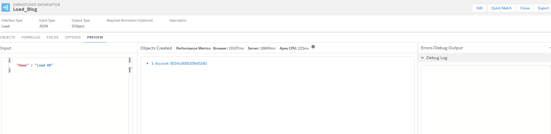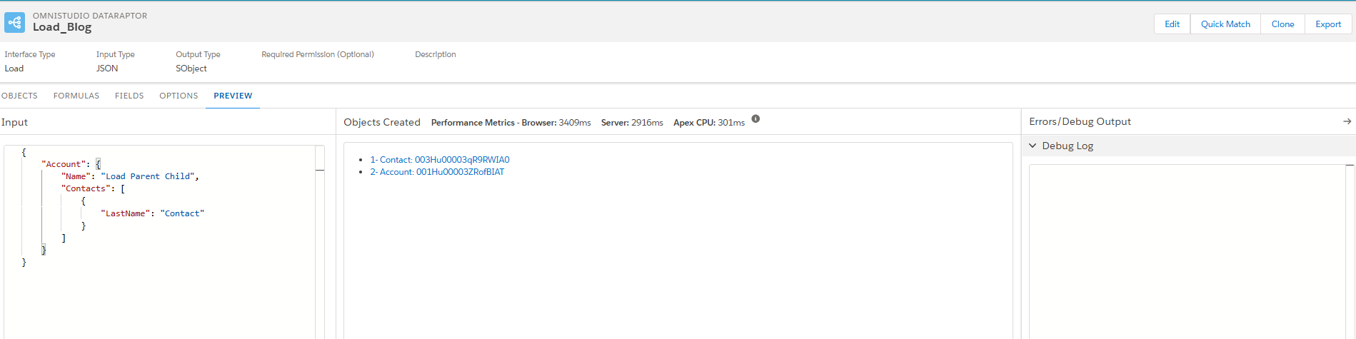 The provided input JSON is loaded into salesforce with the expected relationship and the details of the created record will be displayed. If there is any error in the runtime, it will be notified.