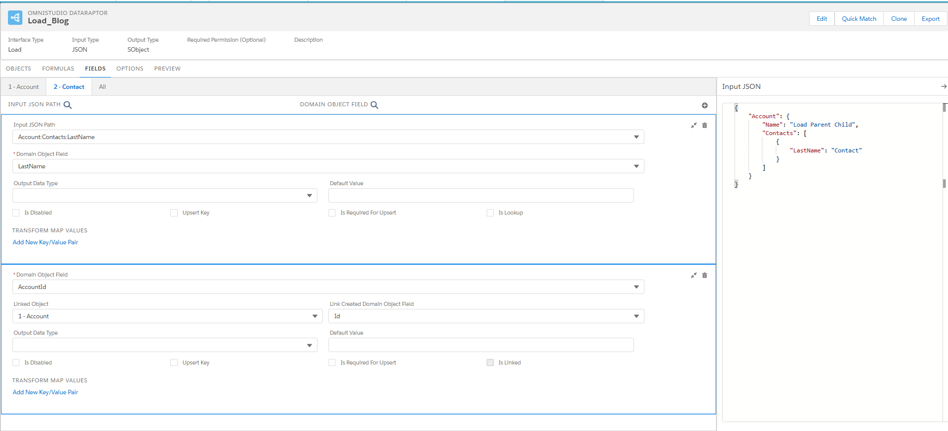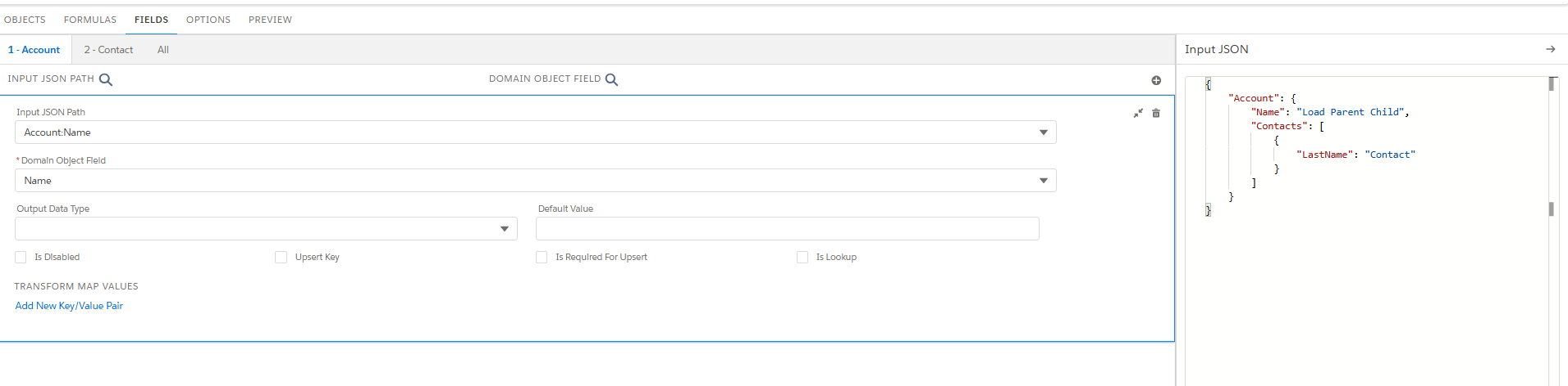 For the provided JSON, Account:Name node will be mapped to name field of the Account, Account:Contacts:LastName node will be mapped to Last name field of the contact object. The relationship field that is AccountId in contact will be mapped in the initial level object config and that will be appeared in Fields tab.