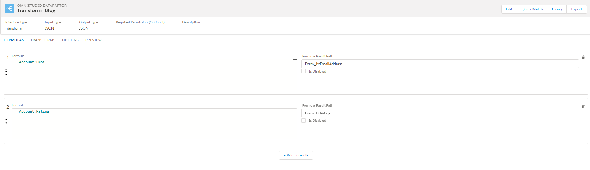 }This tab enables us to include data in the output of our DataRaptor. Enables calculations, conditional logic, and dynamic value transformations. Navigate to the Formulas tab in your DataRaptor and select Add Formula to create a new one.