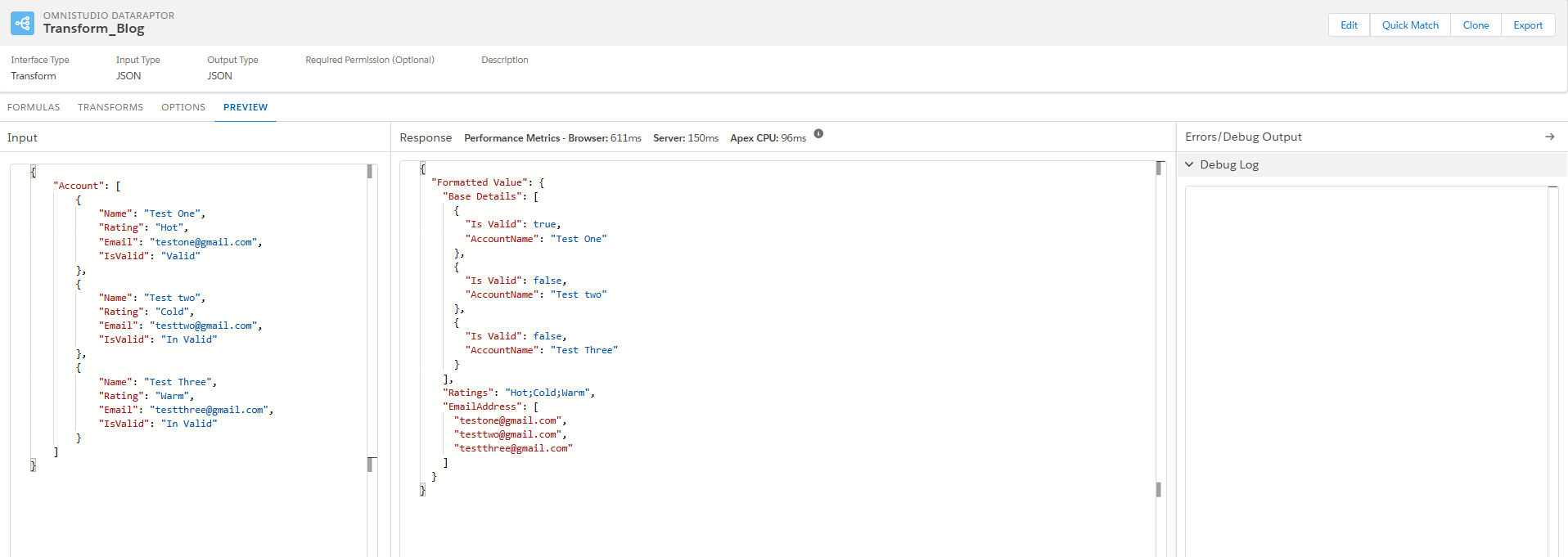 The Preview Tab in DataRaptor Transform allows users to test and validate their data mappings before deploying them. It provides a real-time view of how input data is transformed into the expected output format and also Users can paste sample input data to see how transformations are applied.
