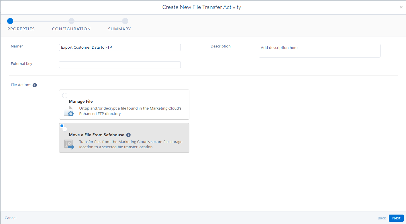 3. Then extract the file transfer activity encrypts file (Optional) from SFMC Safehouse in the safehouse (encryption of the file is entirely optional, If you are dealing with more secured data encrypt the file) and the file has been moved to enhanced FTP.
