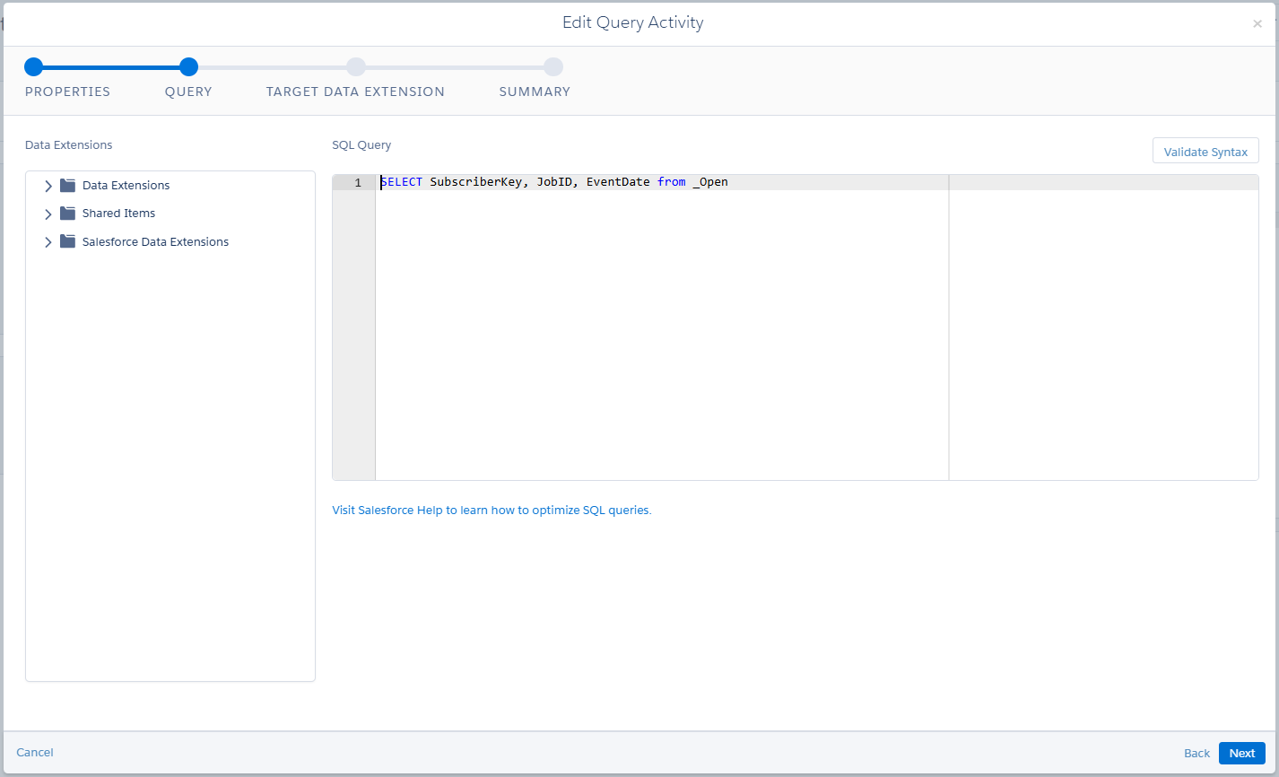 3. Add the query to select the subscriber key, Job ID and Event data from the _Open data view as shown below.