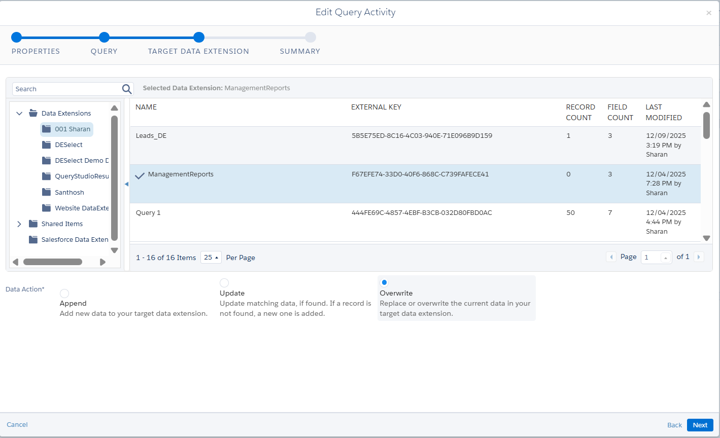 4. Choose the target data extension and choose the name of the data extension. Here, I have chosen the created data extension. Selected the overwrite radio button as shown below.