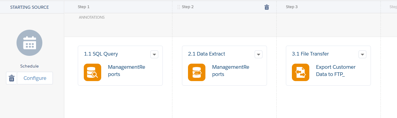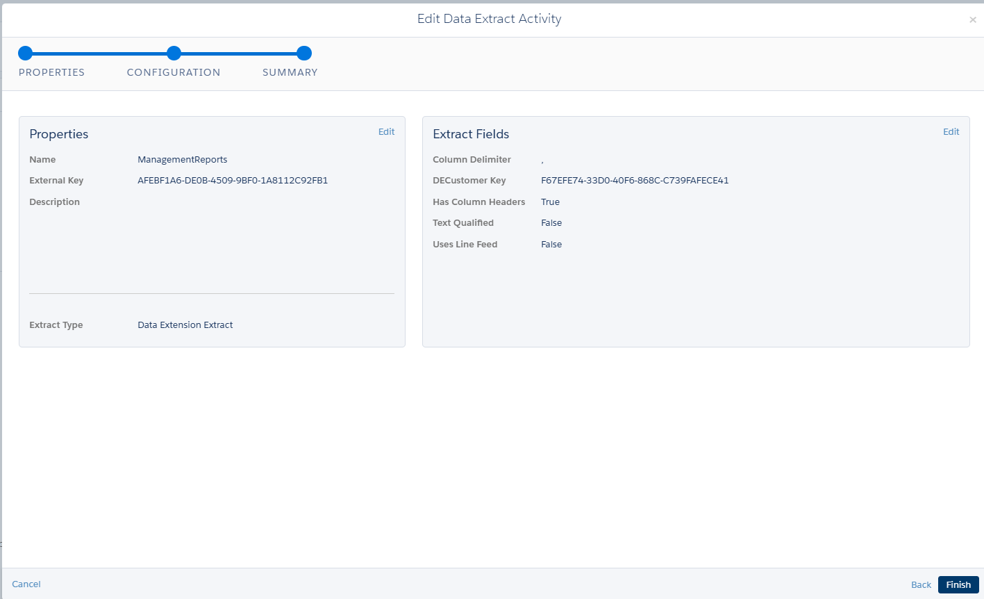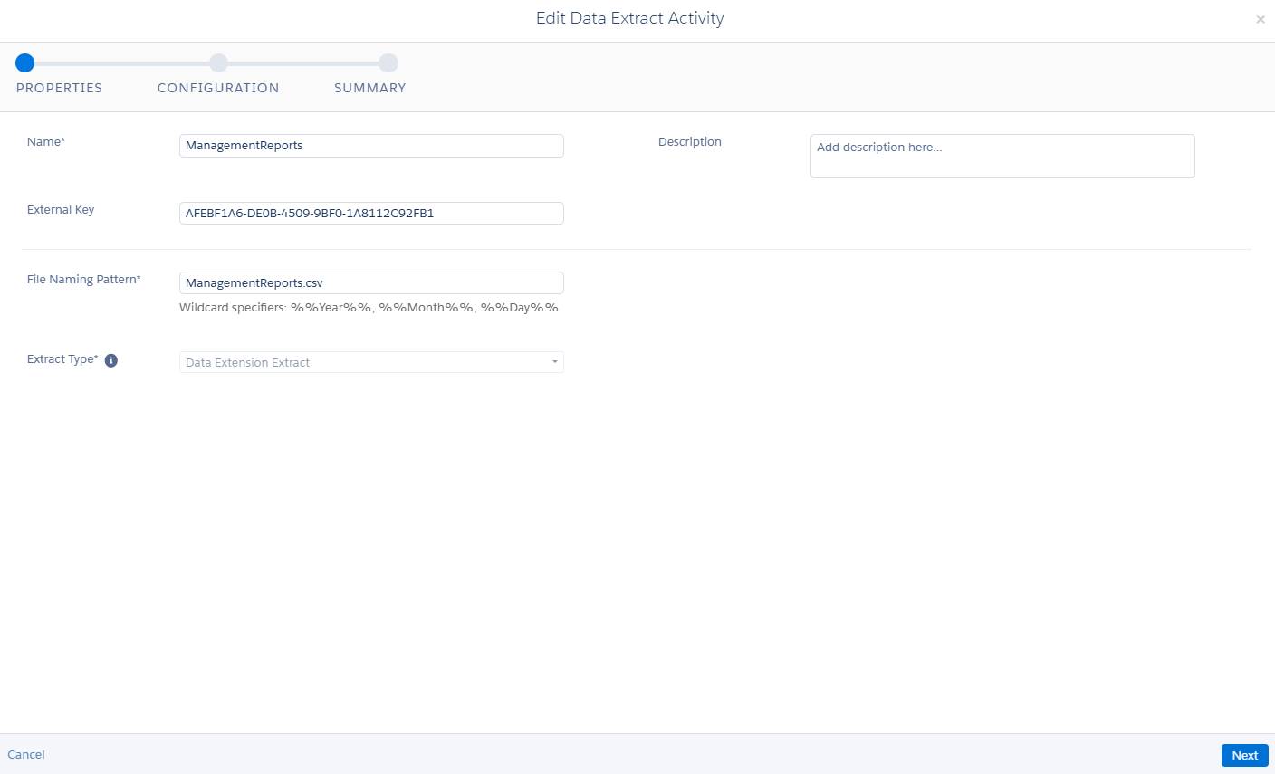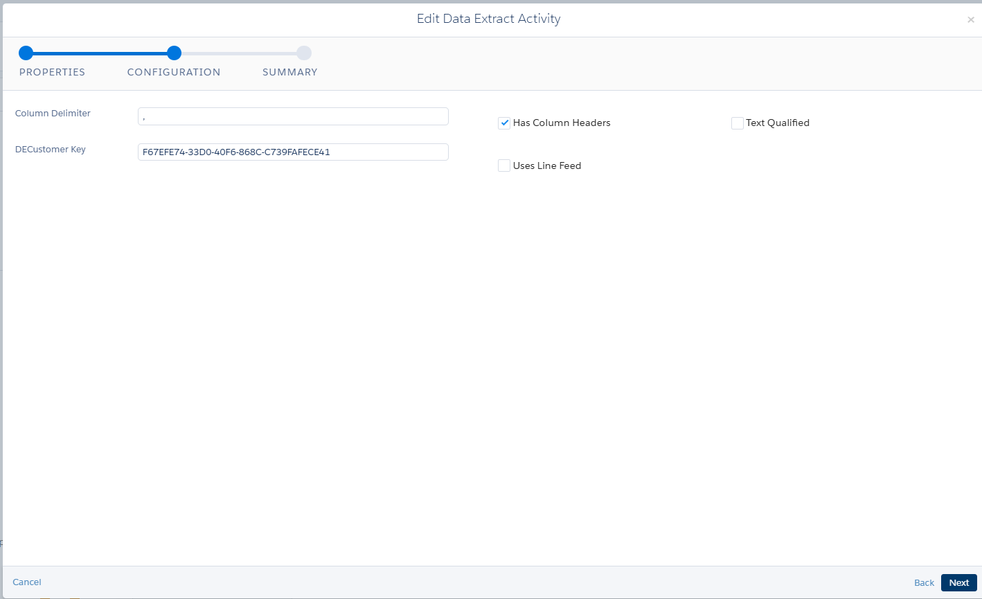 2. The data extract activity exports data from Data extension and uploads the file to SFMC Safehouse in .CSV format.