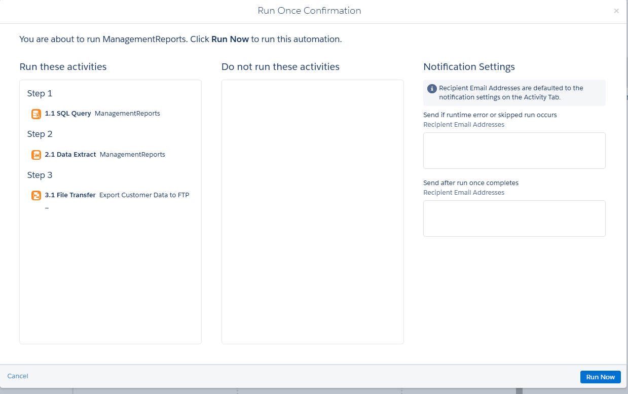 7. Once, after placing the activities save and activate the automation and name the automation. Then run the automation once.