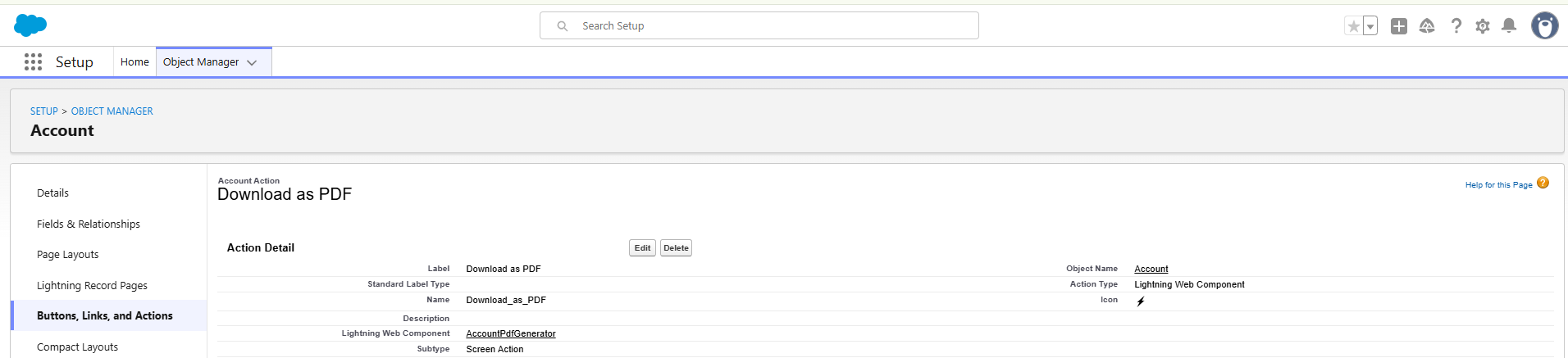 Step 3: Create a button in the Account object called "Download as PDF".