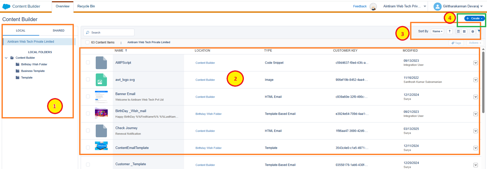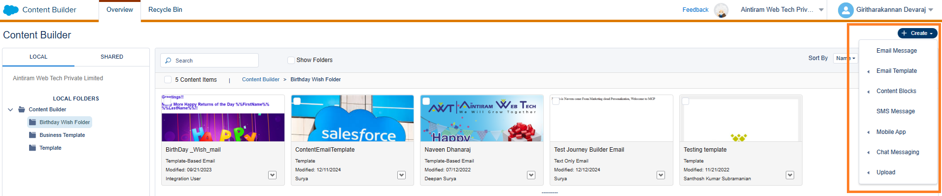 Template List Panel - You can view all Content Builder templates are created in the Content Builder. If you click folder names from the left side menu, you will see the respective templates in this area.