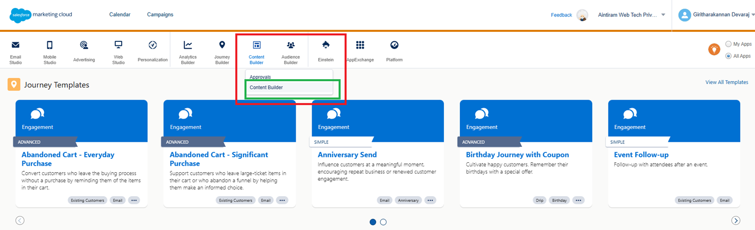 From the above Marketing Cloud landing screen, Click Content Builder Tab & click Content Builder in the dropdown menu to navigate Content Builder work location, then it navigates to below page.