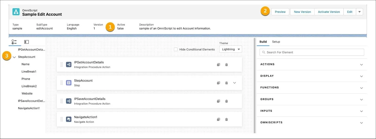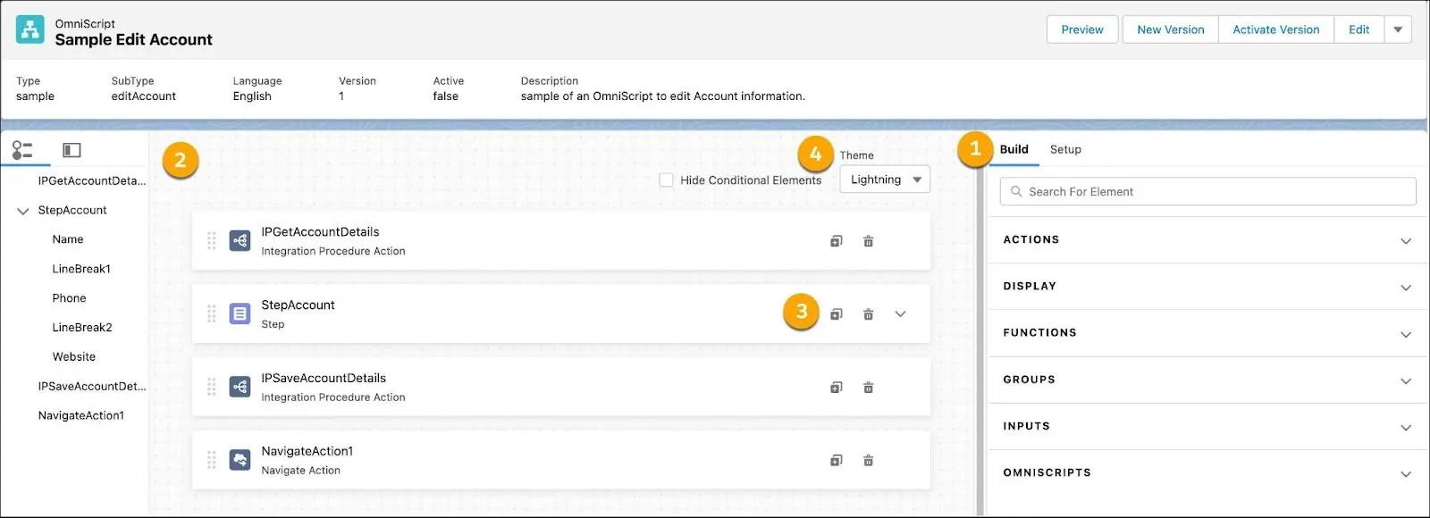 Theme dropdown (3), see how your OmniScript looks with a Lightning or Newport theme. If a custom Newport stylesheet is in the org, it overrides the out-of-the-box Newport stylesheet.