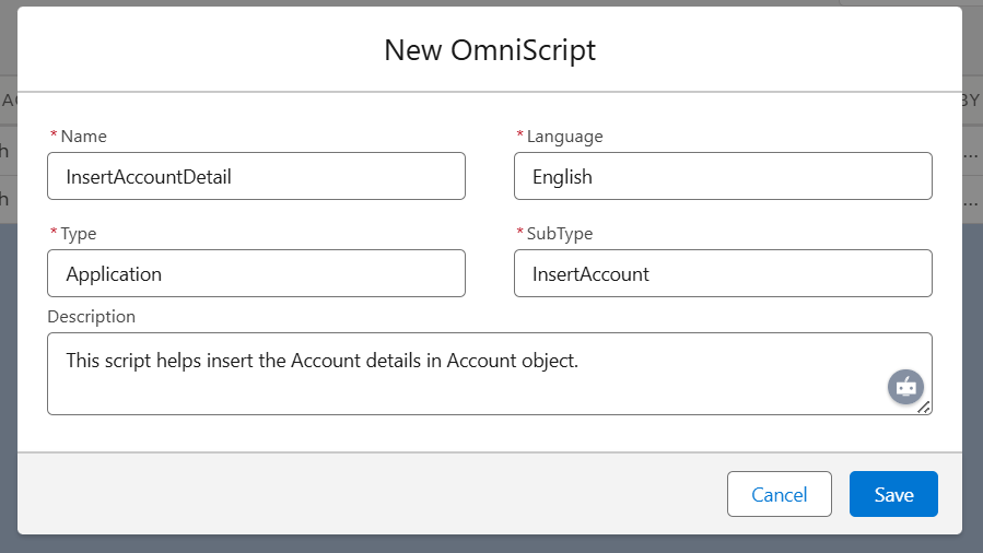 Click the New Button in the right of the page and enter the basic details in your Omniscript.